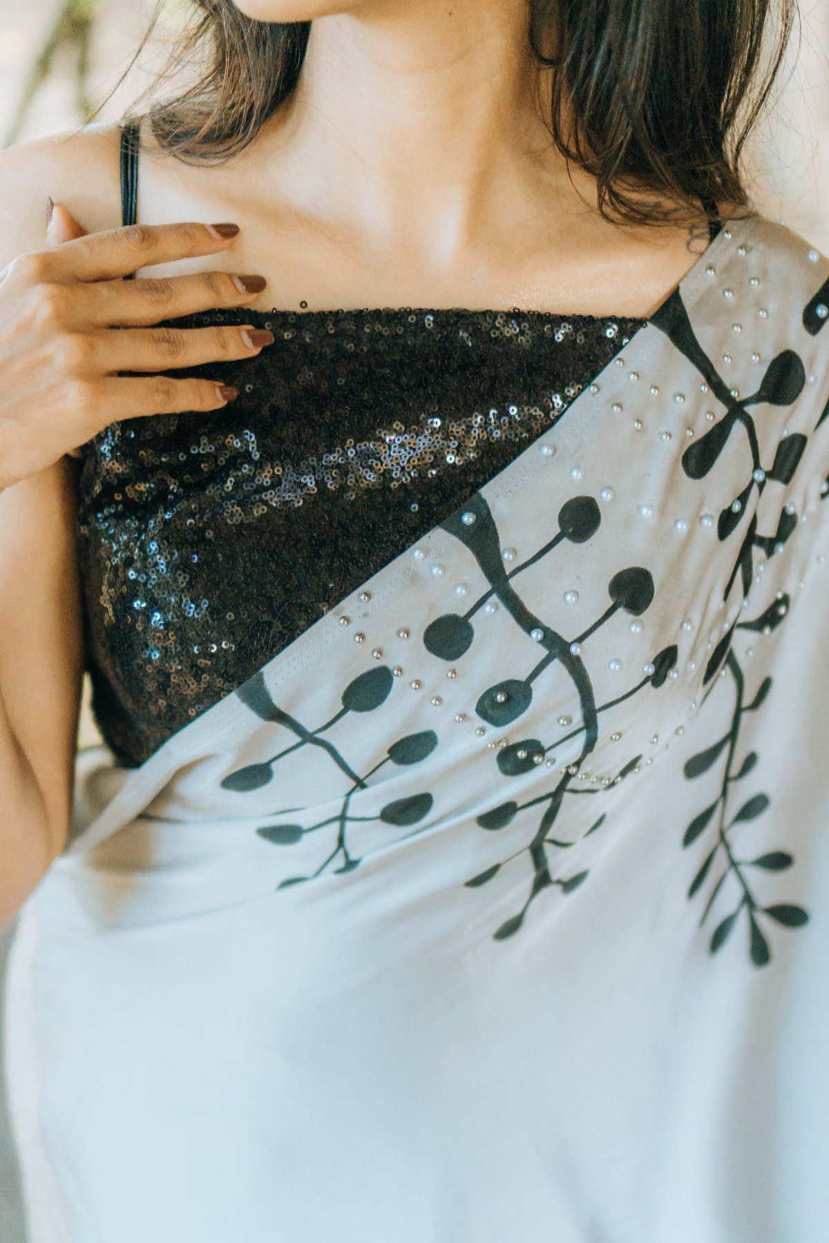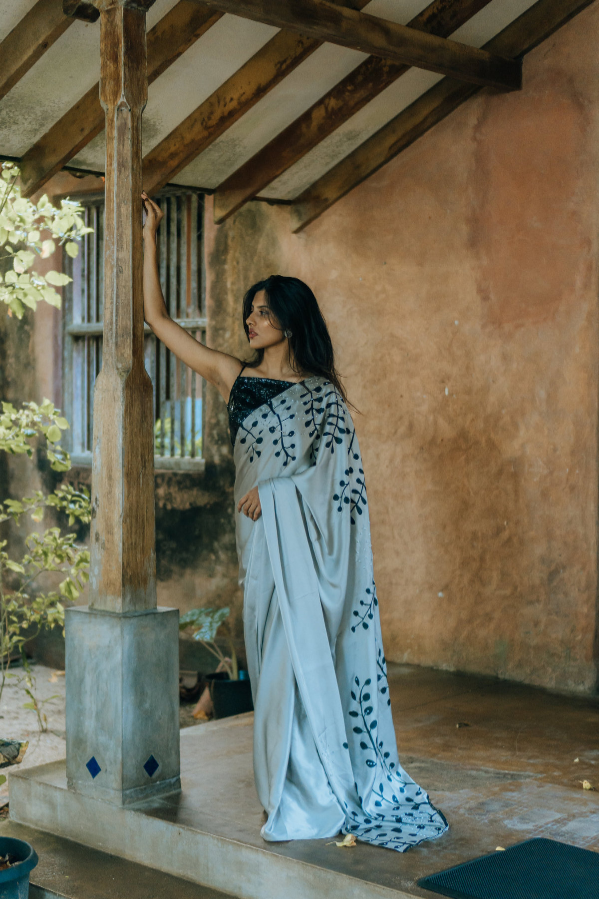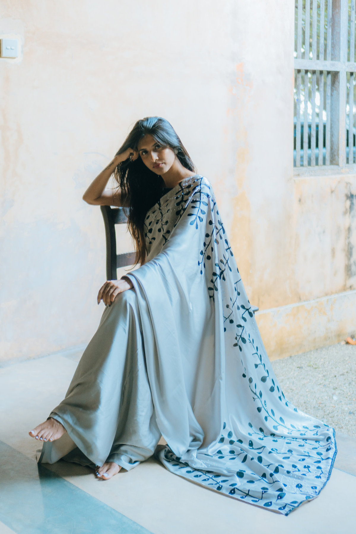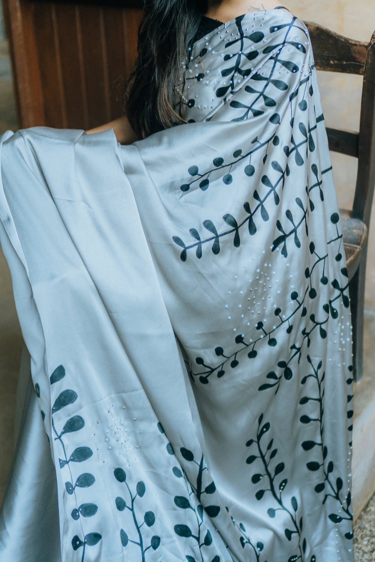 A hand-painted silk saree inspired by the gentle sway of seaweeds and the mysterious shadows of the ocean floor. Adorned with delicate pearls and hand-embroidered beaAdwork, this piece captures the quiet beauty of the deep sea.