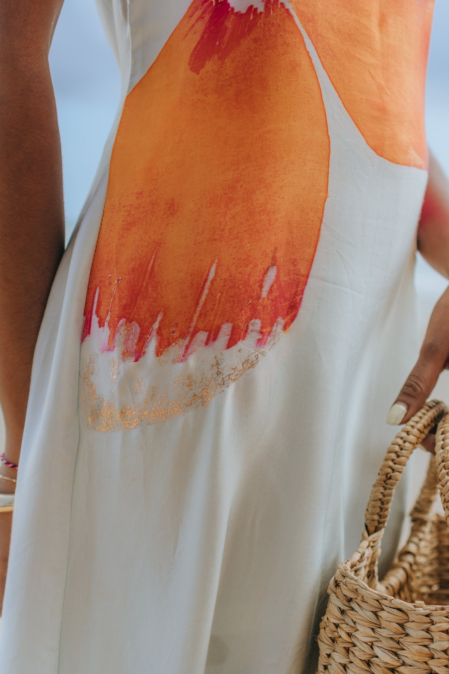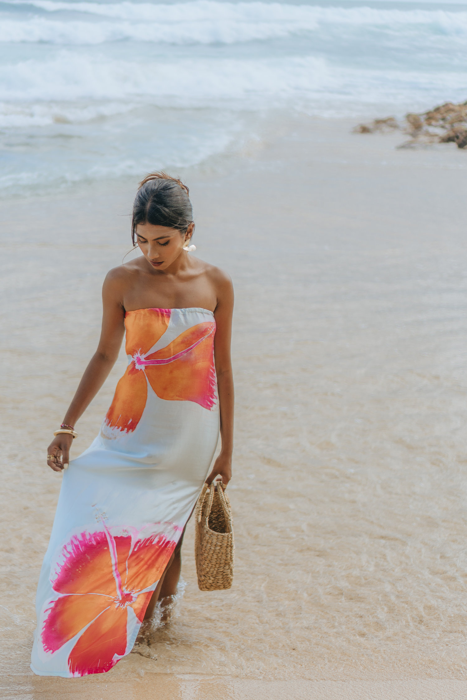 A sleek strapless silhouette in rich, flowing silk. Designed to stand alone.